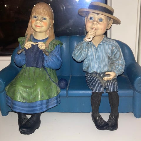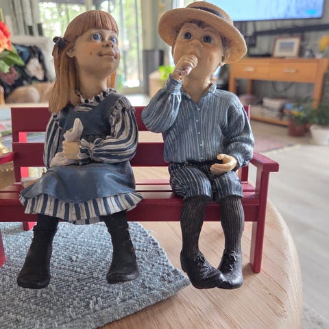3 sett Candy Design figurer av barn på benk. Figurene er detaljerte med naturtro ansiktsuttrykk og klær. Den ene figuren har en bitteliten prikk/skade på kinnet, (se bildet). Selges samlet.