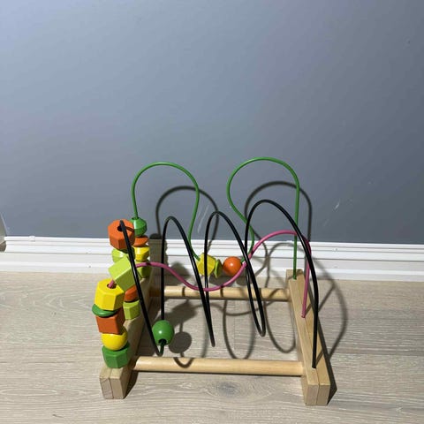 IKEA kuleramme i tre med flerfargede kuler. Rammen består av flere metallstenger med kuler i ulike farger som kan skyves frem og tilbake. Egnet som læringsleke for å øve på telling, enkel matematikk og fargegjenkjenning for barn. Kan stå på bord eller gulv ved hjelp av støtte på baksiden.