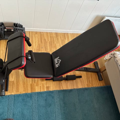 Justerbar treningsbenk i svart og røde striper. Har noen bruksmerker. Det er synlig slitasje og skade i overgangen mellom sete og ryggpute, som vist på bildet. Egnet til styrketrening hjemme.