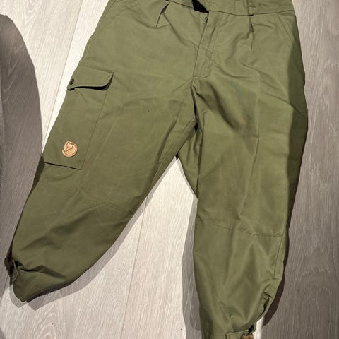Vintage Fjällräven nikkers for dame i størrelse 44. Buksen er grønn og laget i en blanding av polyester og bomull. Modellen har flere lommer, blant annet benlommer med klaff, samt justering nederst på bena. Materialet er merket som ytterstoff og fôr i samme polyester- og bomullsblanding. Egnet som fritids- eller turbukse.
