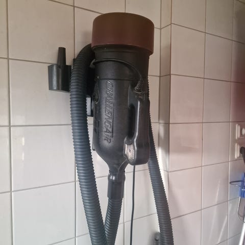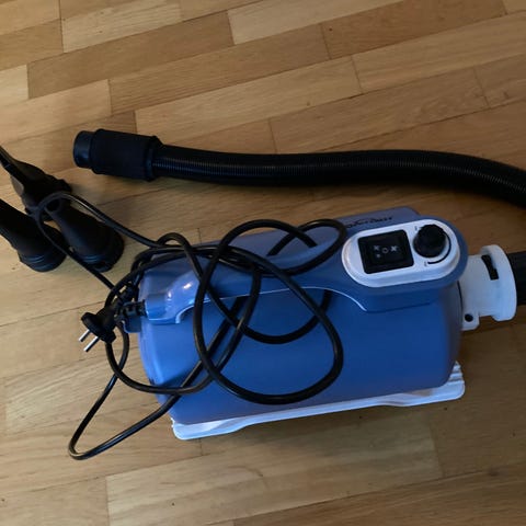 Hund tørkeblåser i turkis farge. Elektrisk blåseapparat med bærehåndtak, fleksibel slange og munnstykke. Enheten har strømbryter og regulering på toppen, samt strømledning med jordet støpsel. Egnet som kraftig luftblåser til tørking og rengjøring av overflater og gjenstander der man ønsker å fjerne vann eller støv uten berøring. Varm og kald funksjon