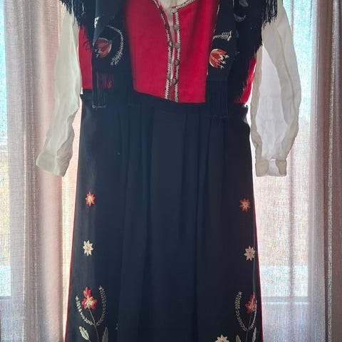 Velger nå å selge min Husfliden rogalandsbunad. Alt er i det originale. Ull i bunaden, lin i skjorta. Alt tilbehør i ekte sølv. Hele belte er og i sølv helt rundt. Øredobber, sko ( str 38) og lue har eg og.Bunaden kan sys ut og inn som ønskes. Er nå sydd inn til ca str s i livet.