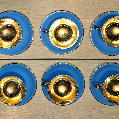 Sort farge og gullfarget innside på koppene. Noe slittasje, men ingen knast eller skar. Se fotoer.