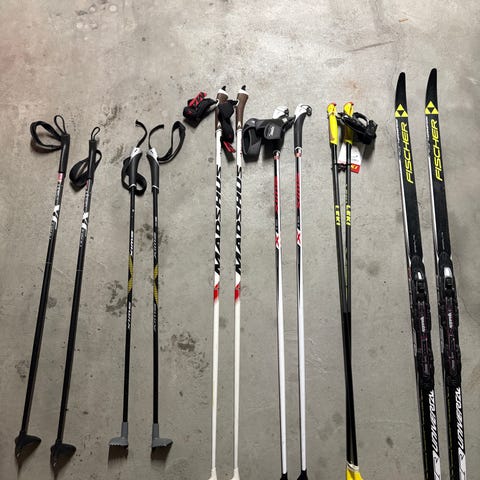 Godt brukt Fischer ski 150cm 2 par kr 300pr par / staver Fischer 110cm 100,- / k2 slalom 100cm kr 700,- pent brukt / Madshus felleski 120cm kr 500, Fischer staver 100cm kr 100.