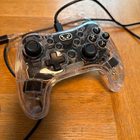 PDP Nintendo Switch kablet håndkontroller i gjennomsiktig plast. Kontrolleren har standard knappelayout med to analoge spaker, styrekryss, skulderknapper og funksjonsknapper tilpasset Nintendo Switch. Den kobles til med kabel og er egnet for bruk med Nintendo Switch-konsoll til ulike typer spill.