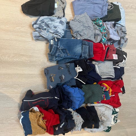 Klespakke med str.110, 110/116 og 116. Bukser 11stk alt ifra dressbukse, fotballbukse, cargo og joggebukse. 9 gensre. 9 tynne gensre/trøyer. 4 penskjorter og 1 jakke.