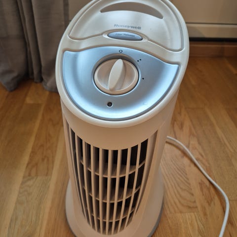 Cotech Mini Tower Fan vifte i hvit farge. Modellen har kontrollpanel på toppen med tidsur (1, 2 og 4 timer), to hastighetsnivåer (HI/LO) og oscilleringsfunksjon (OSC) for svingende luftstrøm. Viften drives på 220–240 V, 50–60 Hz. Egnet som bord- eller gulvvifte i mindre rom der man ønsker sirkulasjon av luft.