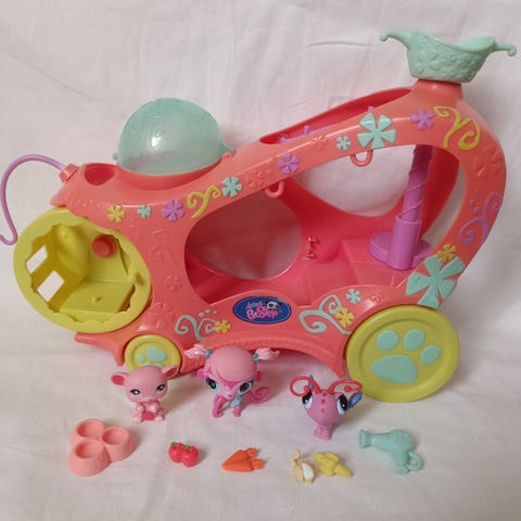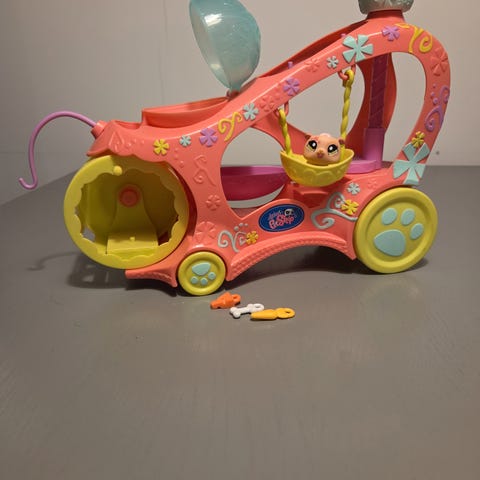 Littlest Pet Shop lekesett matbil. Lekesettet består av en fargerik matbil i rosa og gule toner med ulike lekedetaljer som serveringsdisk, sitteplasser og tilbehør formet som mat. Det følger med små figurer fra Littlest Pet Shop-universet som kan plasseres i og rundt bilen. Lekesettet er egnet for rollelek der barna kan late som de driver en matbil for kjæledyrene. Passer sammen med andre Littlest Pet Shop-figurer og -sett.