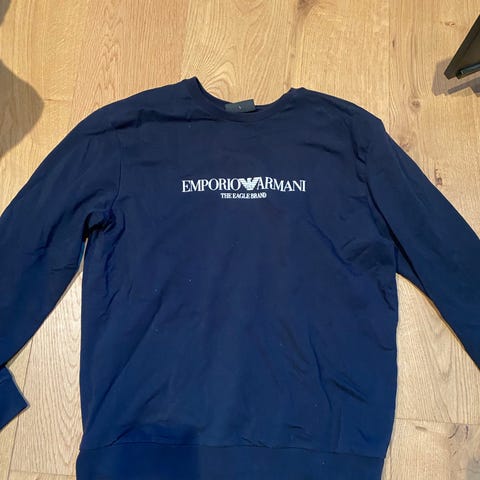 Fin mørkeblå hette genser fra Armani. Har brukt den et par ganger men den har mest vært i skapet og er klar for en ny eier. Ikke noen bruksmerker eller flekker på genseren.