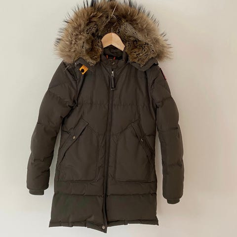 Selger min parajumper i large young. Den passer meg som er s/m til vanlig. Den har noen bruksmerker som vist på bildene, noe slitasje og to «hull» som er blitt tettet igjen med lim. Pelsen henger noe løst (se bilde med glidelås ved pelsen), dette har blitt løst ved å bruke en sikkerhetsnål før. Jeg er 1.69 og den går litt ovenfor knærne mine.