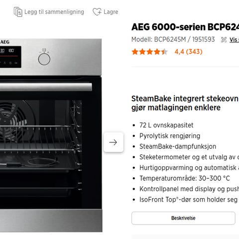 - Type: kompakt stekeovn for innbygging