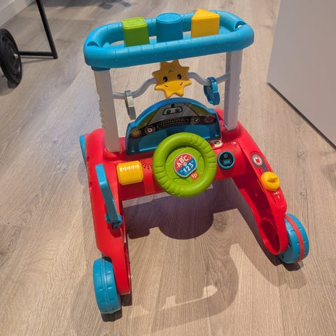 Fisher-Price gåvogn aktivitetsleke. Gåvognen har fire hjul og håndtak som barnet kan holde i når det øver på å gå. Foran er det aktivitetspanel med ratt, knapper og andre elementer som kan dreies og trykkes på. Produktet er fargerikt i hovedsakelig rødt, blått, gult og grønt. Egnet som støtte når barn skal trene balanse og koordinasjon, samt som stående og sittende lek på gulvet.