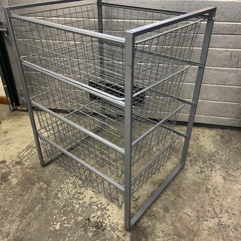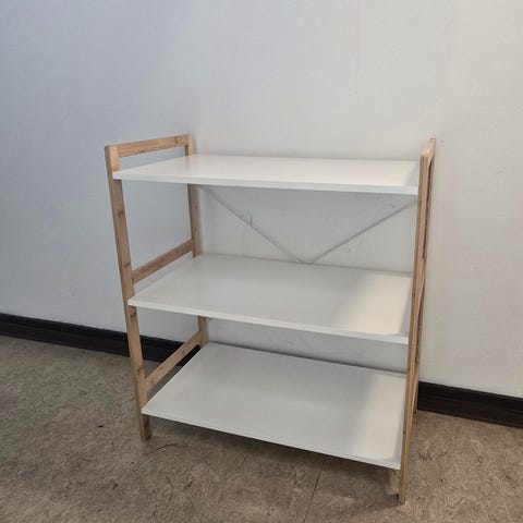 Hvit hylleseksjon med flyttbare kurver, passer både inne i skapet og enkeltstående.