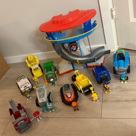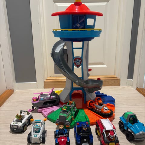 Guttungen vil selge paw patrol samlingen sin da den ikke blir brukt lengre. Lyd og lys i tårnet. Noen av bilene har også lyd.