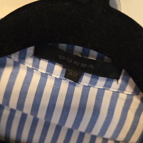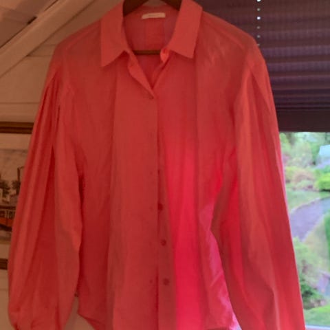 Donna skjorte for dame i størrelse 44. Skjorten er rosa og laget av bomull. Den har krage, lange ermer og knappelukking foran. Stoffet har broderte detaljer/mønster som gir struktur i overflaten. Passer til hverdagsbruk eller mer pyntede anledninger, og kan brukes alene eller over topp/genser.