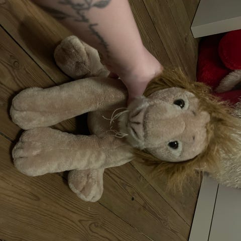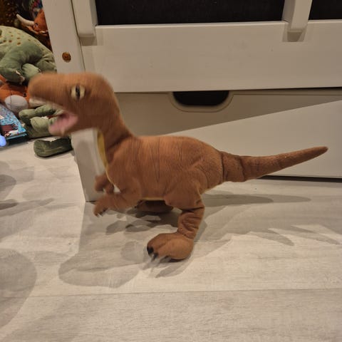 Selger en kjempefin og myk dinosaur‑bamse i lysebrun farge med gult mageparti og røde detaljer i munnen. Den er i veldig god stand, uten skader, hull eller flekker. Perfekt for barn, samlere eller som en koselig gave.
