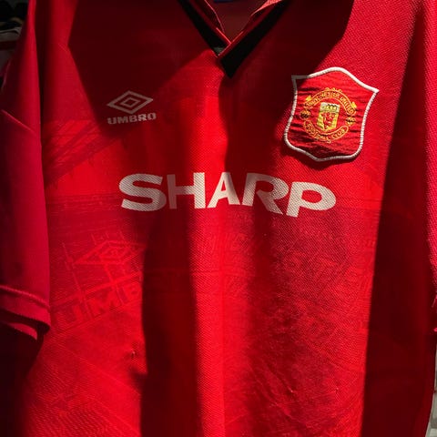 Manchester United samling fotballdrakter og signert hefte rød