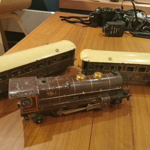 vintage Blikktog togbane med lokomotiv, vogner og skinner