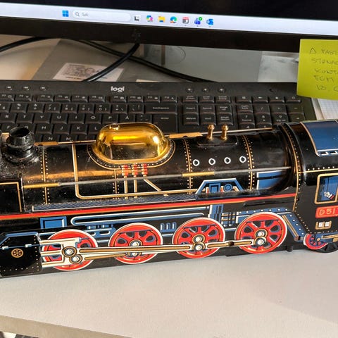 Blikktog togbane med lokomotiv, flere vogner og metallskinner. Settet består av et fargerikt lokomotiv, blant annet en rød tankvogn merket «Oil Tanker 51T 1041», samt andre godsvogner. Toget går på en oval bane av metallskinner, og det følger med et lite hus og en signalstolpe som tilbehør. Egnet som leke eller som samlerobjekt for den som er interessert i eldre blikkleker og modelljernbane.