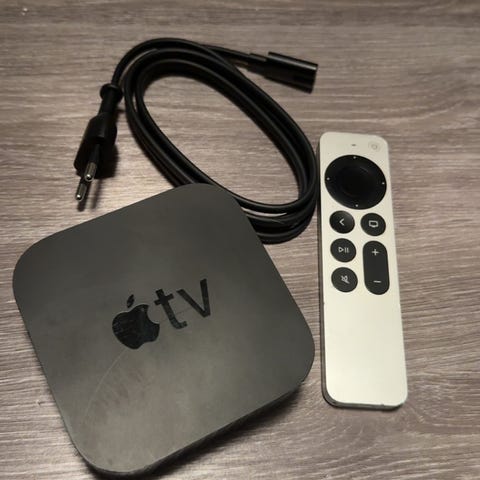 Apple TV med medfølgende fjernkontroll og strømkabel. Enheten kobles til TV via HDMI (kabel ikke synlig på bildet) og gir tilgang til strømmetjenester og annet innhold, avhengig av modell og programvareversjon. Fjernkontrollen brukes til navigasjon i menyer og avspilling. Passer for bruk sammen med kompatibel TV og hjemmenettverk.