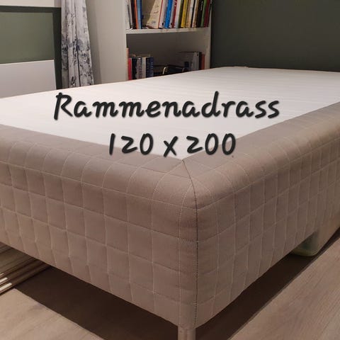 Jysk rammemadrass i grå tekstil. Madrassen har innebygd treramme med lameller på undersiden og avtagbare ben. Passer som enkeltseng eller som del av dobbeltseng ved bruk av to rammemadrasser sammen. Egnet for bruk på soverom, gjesterom eller hybel. Størrelse og fasthetsgrad er ikke oppgitt. 120x200