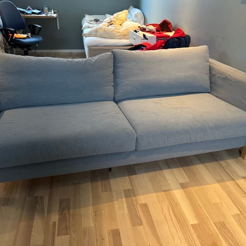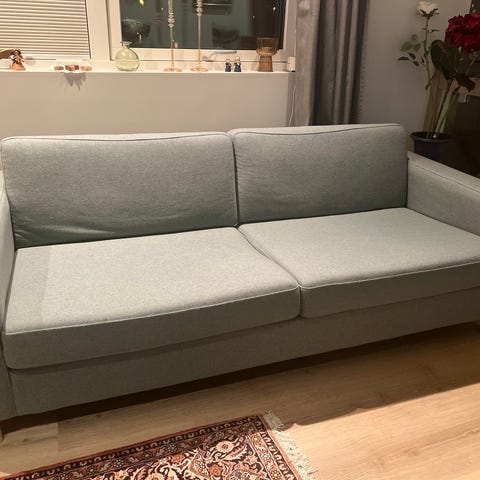 Hel og pen og fortsatt god å sitte i. Sofatrekket er fra Bemz.com - Panama cotton. Det er noe solfalmet, men fint og godt å sitte i. Bildene litt misvisende iforhold til fargenyanser.
