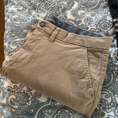 Dressmann Slim Fit chinos for herre i størrelse M (32/32). Buksen er beige og laget i bomull. Klassisk chinosmodell med smal passform, lommer foran og bak, samt beltehemper i linningen. Egnet til både hverdagsbruk og mer formelle anledninger der en enkel og nøytral bukse trengs.