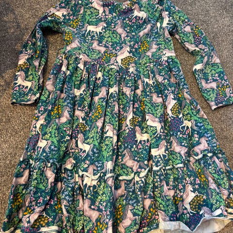 Molo kjole til jente i størrelse 110/116. Kjolen har lang erm, krage og knepping foran. Den er laget i bomull/viskose og har et blått mønster med hester på lys bunn. Skjørtet er rynket i livet for god vidde. Passer til hverdagsbruk og ulike anledninger. Unik og sjelden kjole.