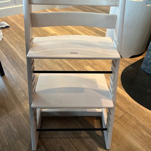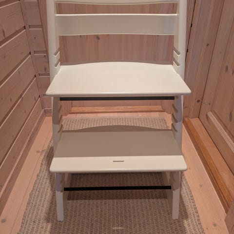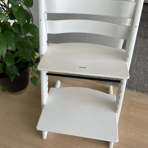 Hvit stol. Det følger med en avtagbar pute, og benforlengere som kan flyttes om man skal bruke babysete. Den har noen bruksmerker ellers i god stand. Må hentes.