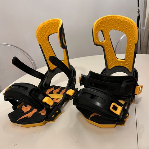 Bindingene har justerbare stropper over foten og ved ankelen, samt høy hælstøtte for god støtte. Passer til montering på snowboard med standard innfesting. Egner seg for bruk i alpinbakke og generell snowboardkjøring.