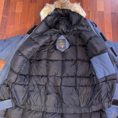 Parajumpers vinterjakke for herre i størrelse L. Jakken er svart og laget i polyester. Den har hette med pelskant, flere ytterlommer med klaff og glidelås, samt ribbestrikkede mansjetter på ermene. Innvendig er jakken vattert for ekstra isolasjon. Passer til bruk i kaldt vær og vinterforhold.