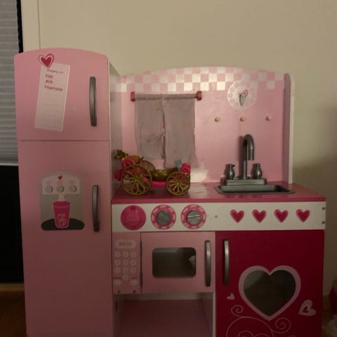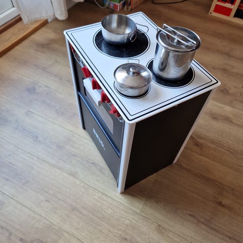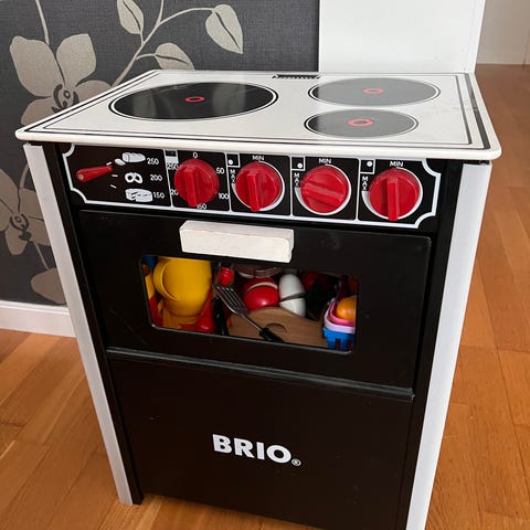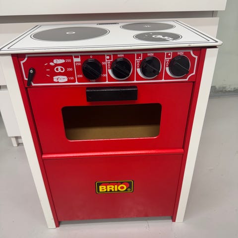 BRIO lekekjøkken med komfyr og vask i rød farge. Sett med separat komfyr og kjøkkenbenk med vask. Komfyren har tre kokeplater på toppen, dreibare knotter og ovnsdør med vindu. Vasken har hvit oppvaskkum, to kraner og skapdør under. Passer til rollelek på barnerom eller lekerom. Laget som solid lekemøbel i klassisk BRIO-design.