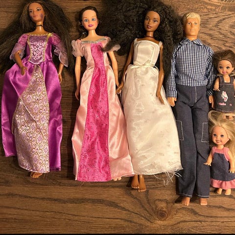 Barbie dukker blandet lot. Pakken inneholder flere Barbie-dukker i ulike antrekk og farger. Dukkene har forskjellige hårfarger og klær, blant annet kjoler, skjørt og topper i ulike mønstre og farger. Passer som lekesett for barn som liker rollelek med dukker og utkledning. Antall dukker og klær er som vist på bildene.