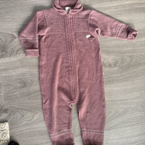 Lillelam ulldress for jente i størrelse 92. Heldress i rosa merinoull med glidelås foran. Ribbestrikkede mansjetter ved ermer og ben for bedre passform. Plagget er laget i myk merinoull som egner seg godt som innerste eller mellomste lag i kjøligere vær. Dressen er pent brukt av et barn. Dessverre har den fått to bruks merker som vist på bilde.