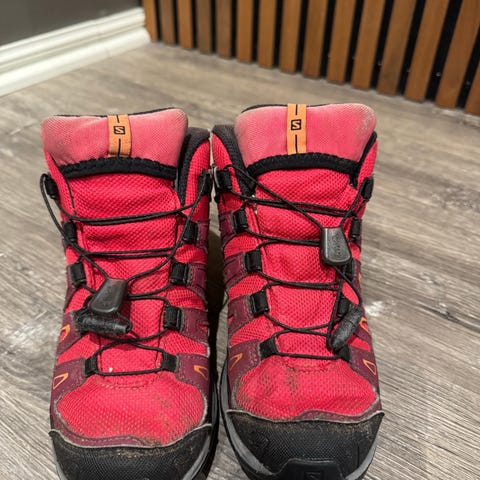 Salomon barnesko i størrelse 38 for unisex. Skoene har høyere skaft og hurtigsnøring. Overdelen er i rødt materiale med mørke og rosa detaljer, og sålen er i mørk gummi med grovt mønster. Egnet som fritids- og tursko for barn i denne størrelsen.