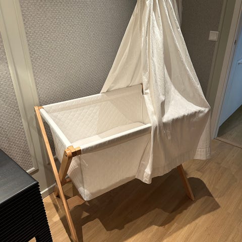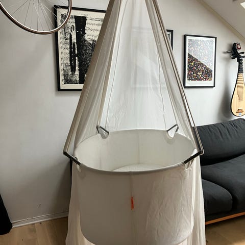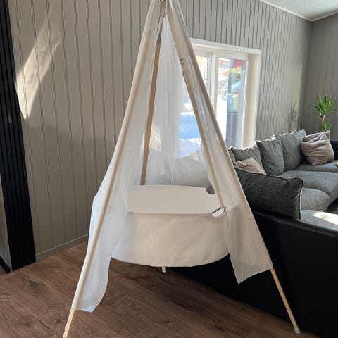 Leander vugge på stativ med sengehimmel. Kjøpt på Finn i 2025. Det er kommet et hull i tekstilen til vuggen, og et par bruksflekker (se bilde). Har ikke prøvd å sy hullet eller fjerne flekkene.