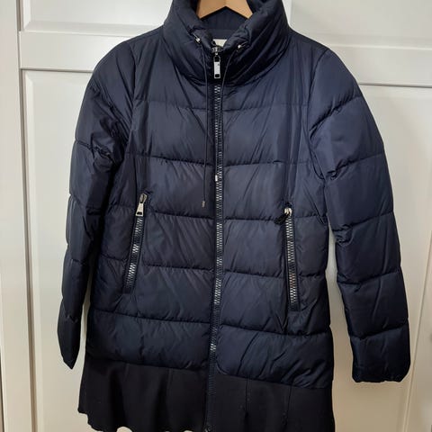 Moncler ytterjakke for dame i størrelse 38. Jakken er laget i Gore-Tex-lignende materiale og har hovedfarge svart med røde partier. Modellen har høy krage og glidelåslukking foran. Det er glidelåslommer i sidene. Det er også hette. Ytterjakken egner seg til bruk i hverdagen og til utendørsaktiviteter der man ønsker et vannavvisende og vindtett plagg.