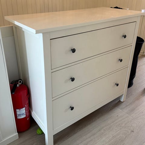 Kommode med 8 skuffer, hvit beis, 160x96 cm. Noen bruksmerker, men er i generelt god stand.