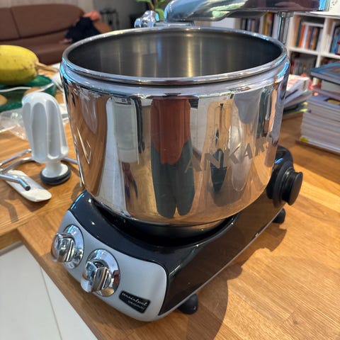 Ankarsrum Assistent Original kjøkkenmaskin i rustfritt stål. Maskinen har stor bolle i metall og leveres med ulike tilbehør, blant annet visper og eltekrok. Maskinen er ren og pen, og lite brukt.