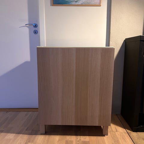 Høyglanset hvit sjenk/kommode i type Bestå fra Ikea. Vi hatt den noen år, men den er i fin stand. Et par små merker på fronten som ikke synes mye. Se bilder. Må hentes.