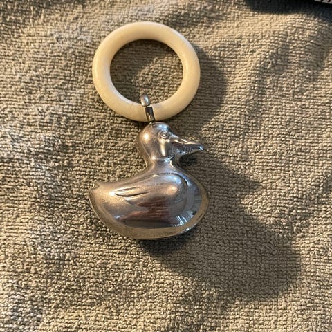 Er litt usikker på om denne er antikk, den er i hvert fall veldig gammel. Jeg har en annen rangle ute også etter familie, den er fra 1918, så kan være antikk. Merker 830S. Bjørnen er ca 4,5 cm, inkludert rangle 9,5 cm.