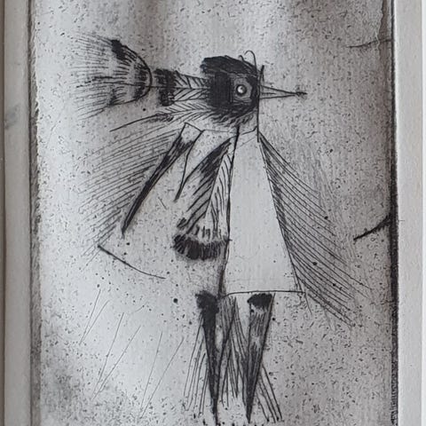 Et lite, men morsomt grafisk blad med to fabeldyr, trolig fra 1970. Monogramsignert. Nyere innramming med sølvfarget ramme (litt slitt), glass og passepartout. Rammen måler ca 31x26 cm, lysåpningen er ca 9x13 cm. Gjenskinn i glasset. Pris er inkludert kunstavgift.