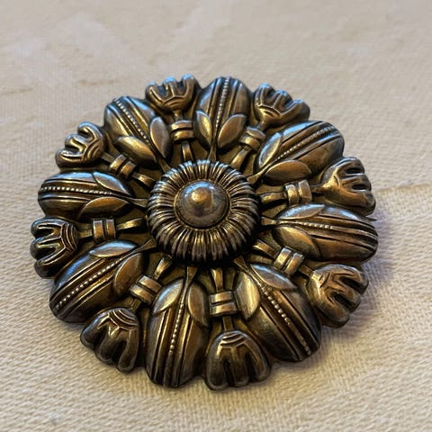 Flott antikk sølje / brosje med blader og store blomster. Diameter 6 cm. Vekt 27 gram. Sølvverdi ved smelting utgjør 480 kr pr 26.2.2026. Selges høystbydende over 900 kr