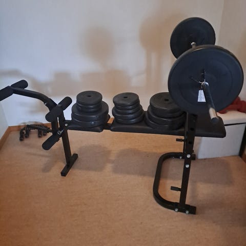 Lite brukt benkpress benk, flat og skrå vinkel (valgfritt). Vektstang + curlstang