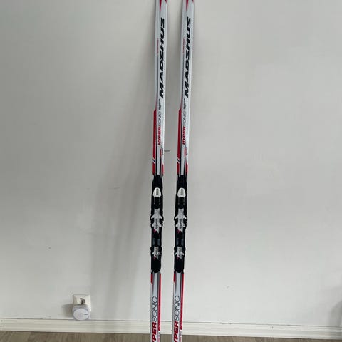 Madshus Hypersonic skøyteski 185 cm i rød/hvitt design. Skiene er konstruert med 3D carbon construction. Påmontert Rottefella-binding (NIS-system)