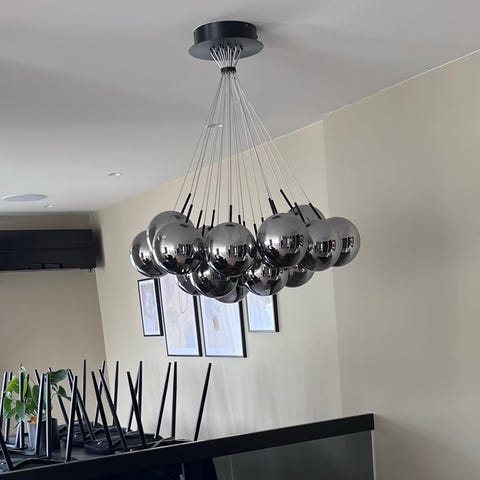 Flott taklampe (Grand bubbles) fra StoneField. 19 glasskuler i fargen smoke. Kjøpt i 2022/2023 fra Lampehuset. Kjøpt for 10.999kr. Gått ut av produksjon, så denne finnes ikke i butikken lenger. 19 ledpærer følger med. Nypris for ledpærer ca.2000kr. Fjernkontroll følger med.