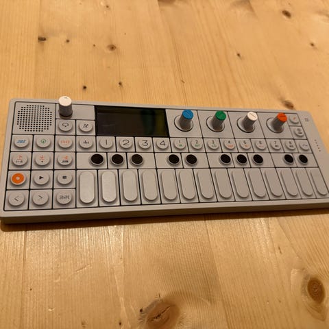 Elektron Model:Cycles grooveboks i grå farge. En kompakt digital tromme- og synthmaskin med flere dedikerte motorer for perkusjon og melodiske lyder. Enheten har innebygd sekvenser, flere roterende kontrollere for lydforming, display for oversikt over parametere og funksjonsknapper for mønster- og prosjektstyring. Strømtilkobling via DC-inngang (12 V). Egnet som sentral enhet eller tillegg i elektroniske musikkoppsett, både i studio og til livebruk.