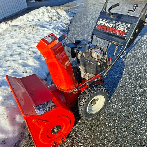Ariens snøfreser i rød farge. Bensindrevet modell med tohjulstrekk og håndtak for manøvrering. Utkasterrenne i front som kan justeres med spak fra førerposisjon. Egnet for rydding av innkjørsler, gårdsplasser og andre mindre uteområder, 2 kjettinger.