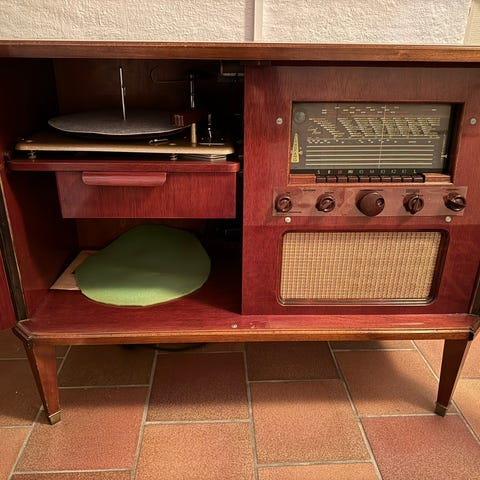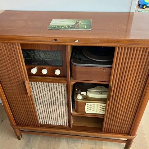 Selger her ett fint skap med fungerende innfelt Tandberg Sølvsuper radio.