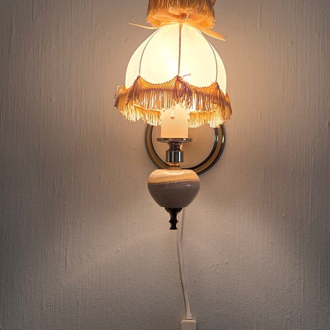 Lampen har en klassisk design med messingfargede skjermer og treverk. Dekorfarge "bonderød", grønt og svart. Passer fint som leselampe i soverom.